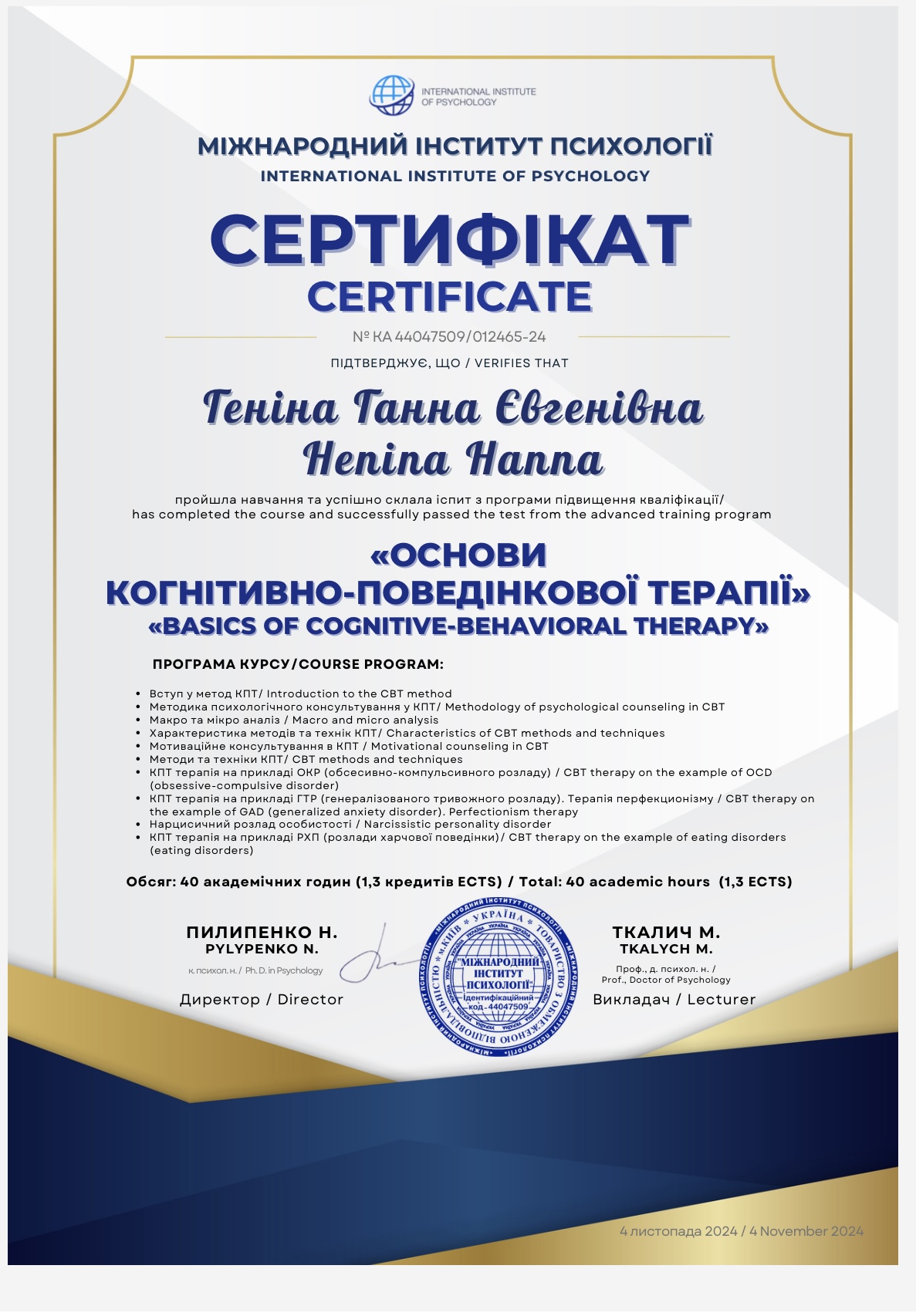 Мои ценности основаны на безусловном уважении, доброжелательности и понимании личности человека. В процессе работы я стараюсь создать теплую, доверительную среду, где вы сможете почувствовать себя спокойно и комфортно. Я понимаю и ценю то, что каждый человек уникален и отношусь с уважением и ответственностью к каждой личности. Внимательность, понимание и отзывчивость – это основные аспекты моей работы, позволяющие прикоснуться к внутреннему миру человека ради поддержки и преодоления проблем. В своей работе я применяю интеграцию методов эмоционально-образной, когнитивно-поведенческой и арт-терапии. Это дает уникальную возможность найти индивидуальный подход к каждому клиенту и наиболее комфортно, бережно и эффективно получить результат.