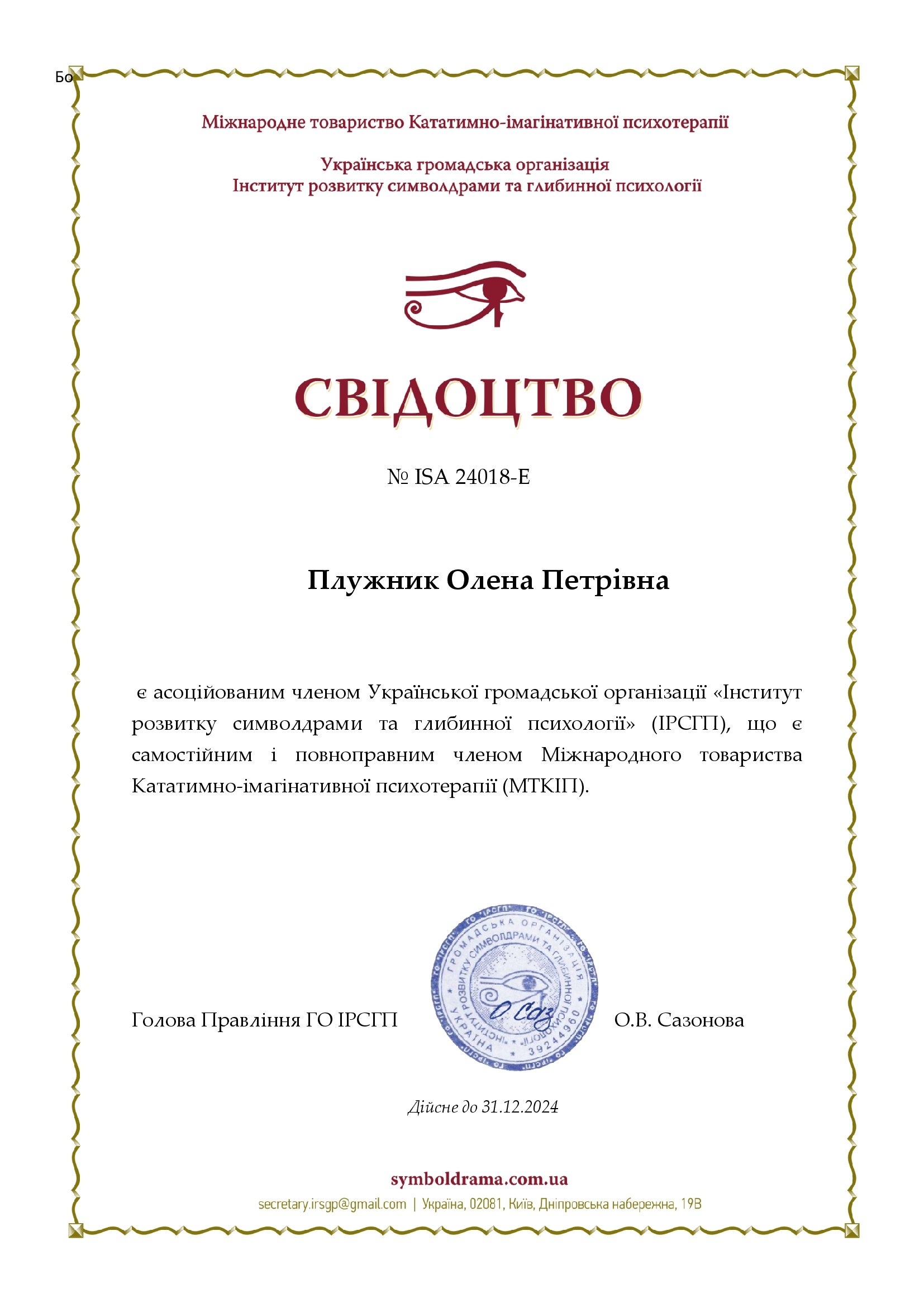 5. Свидетельство Программа подготовки сертифицированных тренеров или МВА для психологов. Восточноукраинская ассоциация арт-терапии «Основа»