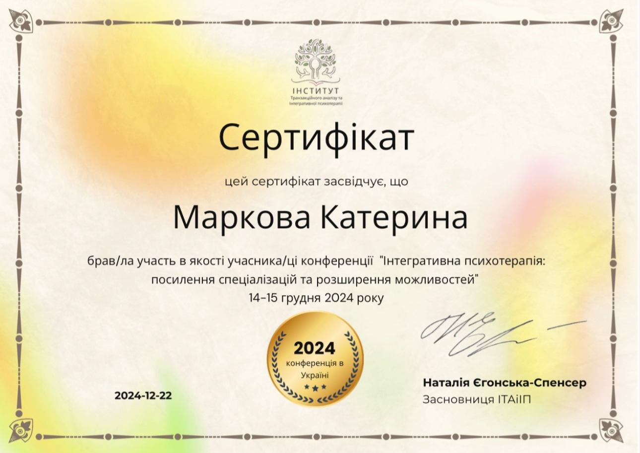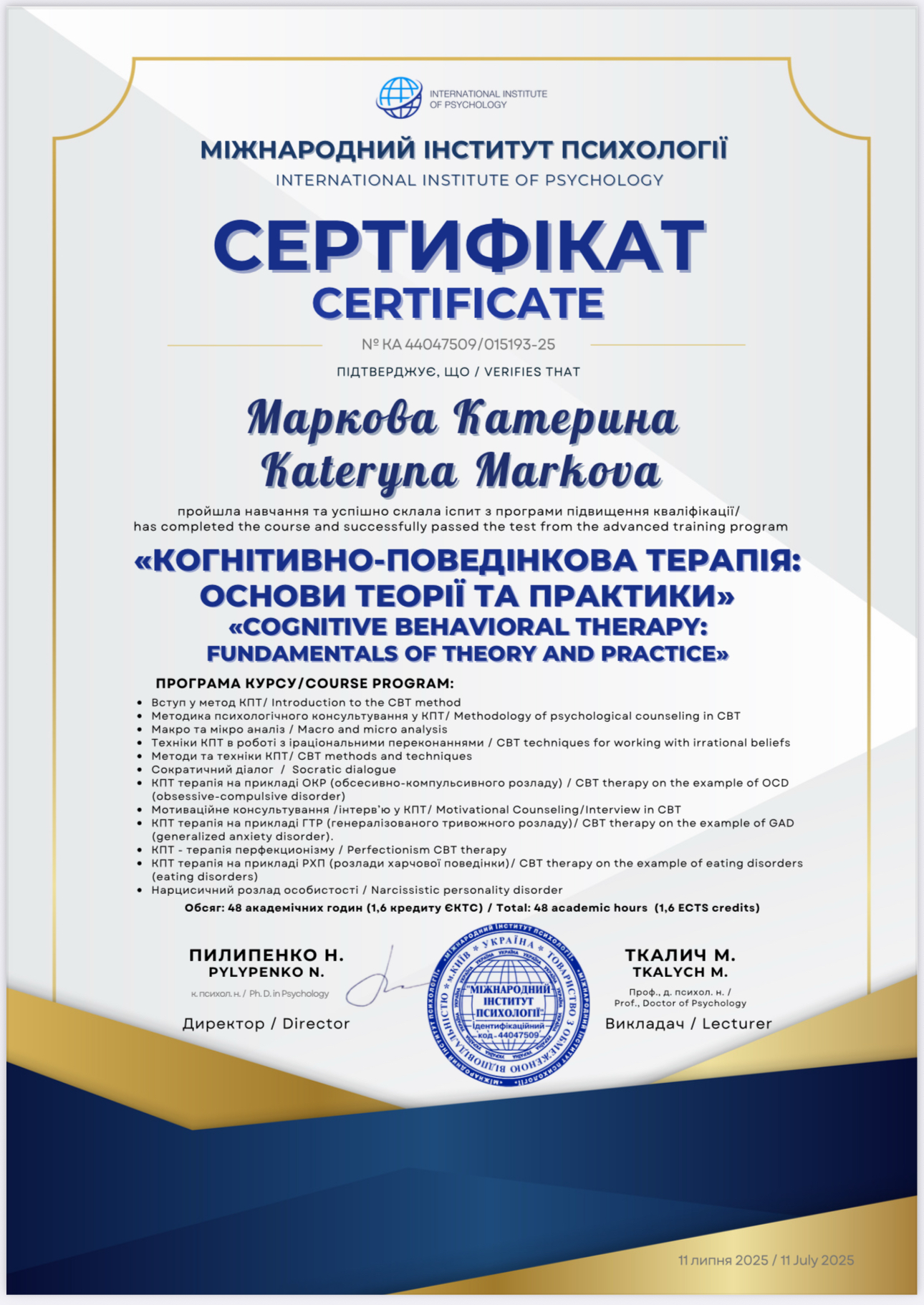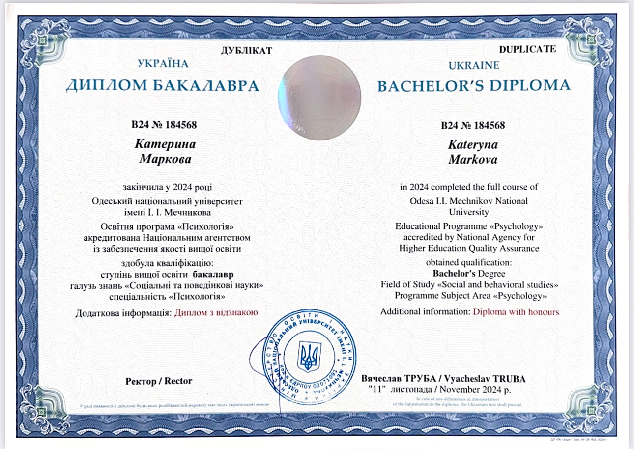 Бакалавр ( з відзнакою) Одеський національний університет ім. I.I.Мечникова (спец. Психологія) 2020 - 2024 Магістр Одеський національний університет ім. І.І.Мечникова (спец. Психологія) 2024 - теперішній час Курс когнітивно-поведінкової терапії. Міжнародний інститут психології 2025р. Курс підготовки консультанта на лінію психологічної підтримки. Організація «Спіріт» 2022-2023рр. Навчальний тренінг « 1-ша психологічна допомога» Асоціація «Психея» 2024р. Зараз маю процес сертифікації з курс «Психосоматика» Наукові конференції