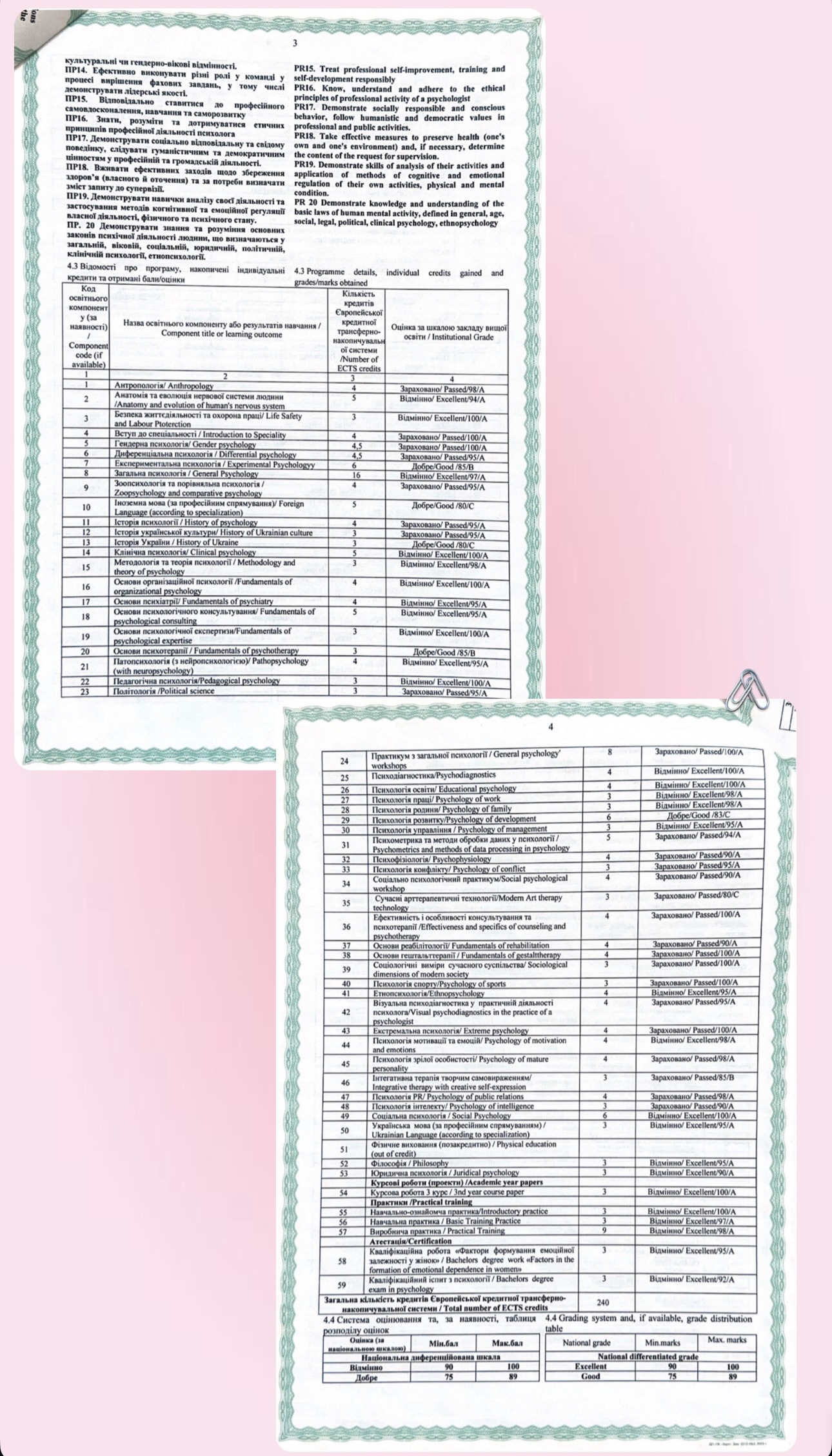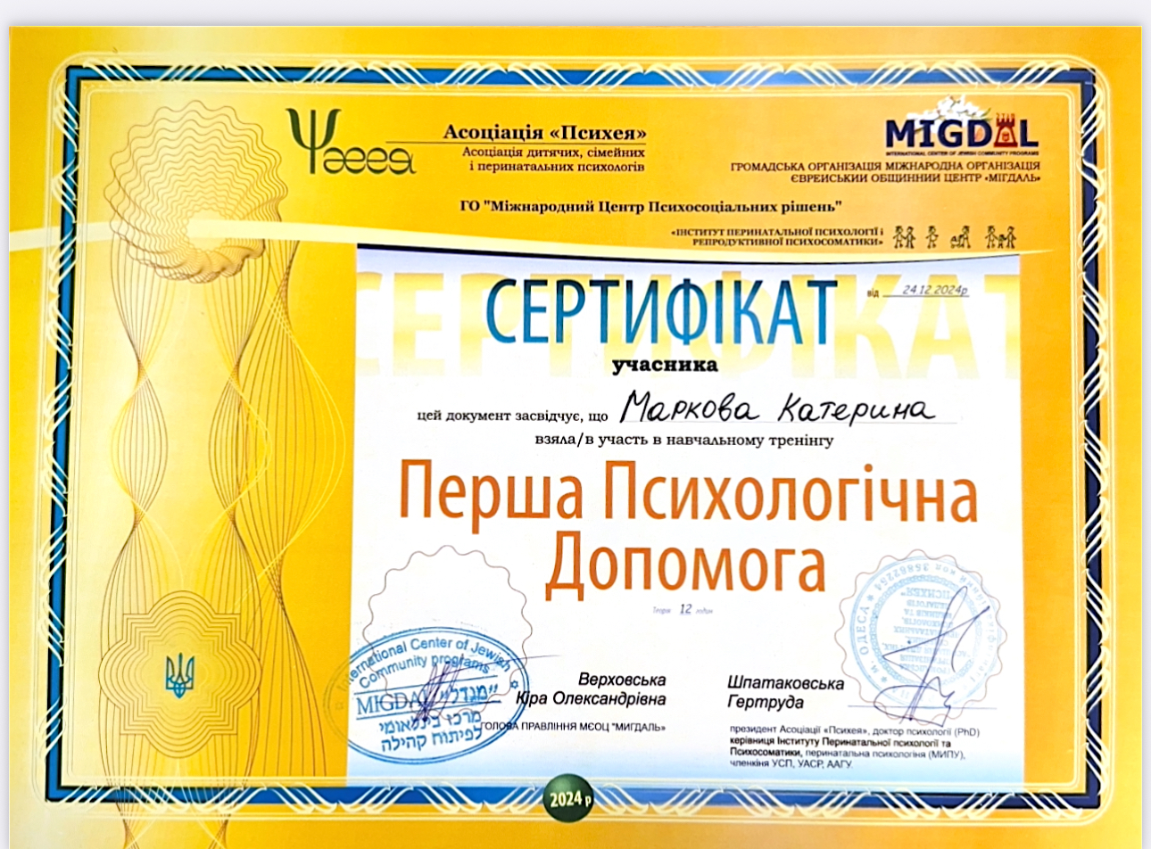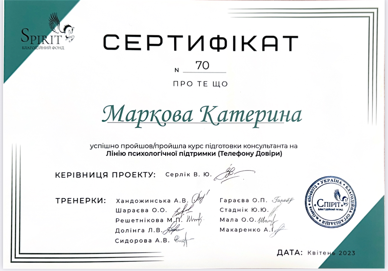 Бакалавр ( з відзнакою) Одеський національний університет ім. I.I.Мечникова (спец. Психологія) 2020 - 2024 Магістр Одеський національний університет ім. І.І.Мечникова (спец. Психологія) 2024 - теперішній час Курс когнітивно-поведінкової терапії. Міжнародний інститут психології 2025р. Курс підготовки консультанта на лінію психологічної підтримки. Організація «Спіріт» 2022-2023рр. Навчальний тренінг « 1-ша психологічна допомога» Асоціація «Психея» 2024р. Зараз маю процес сертифікації з курс «Психосоматика» Наукові конференції