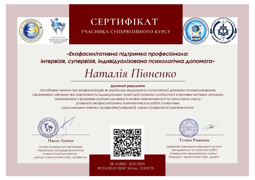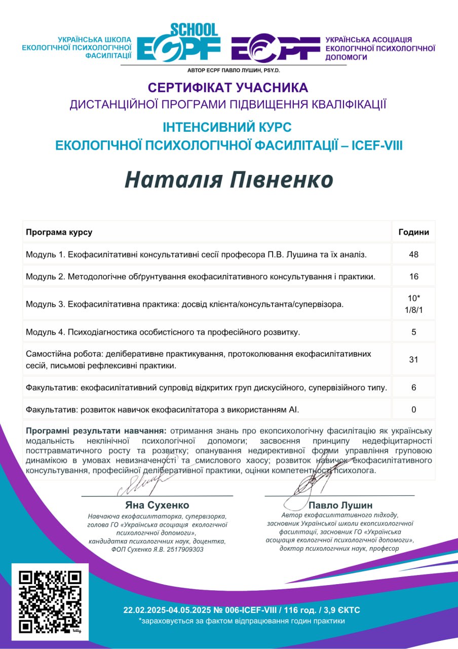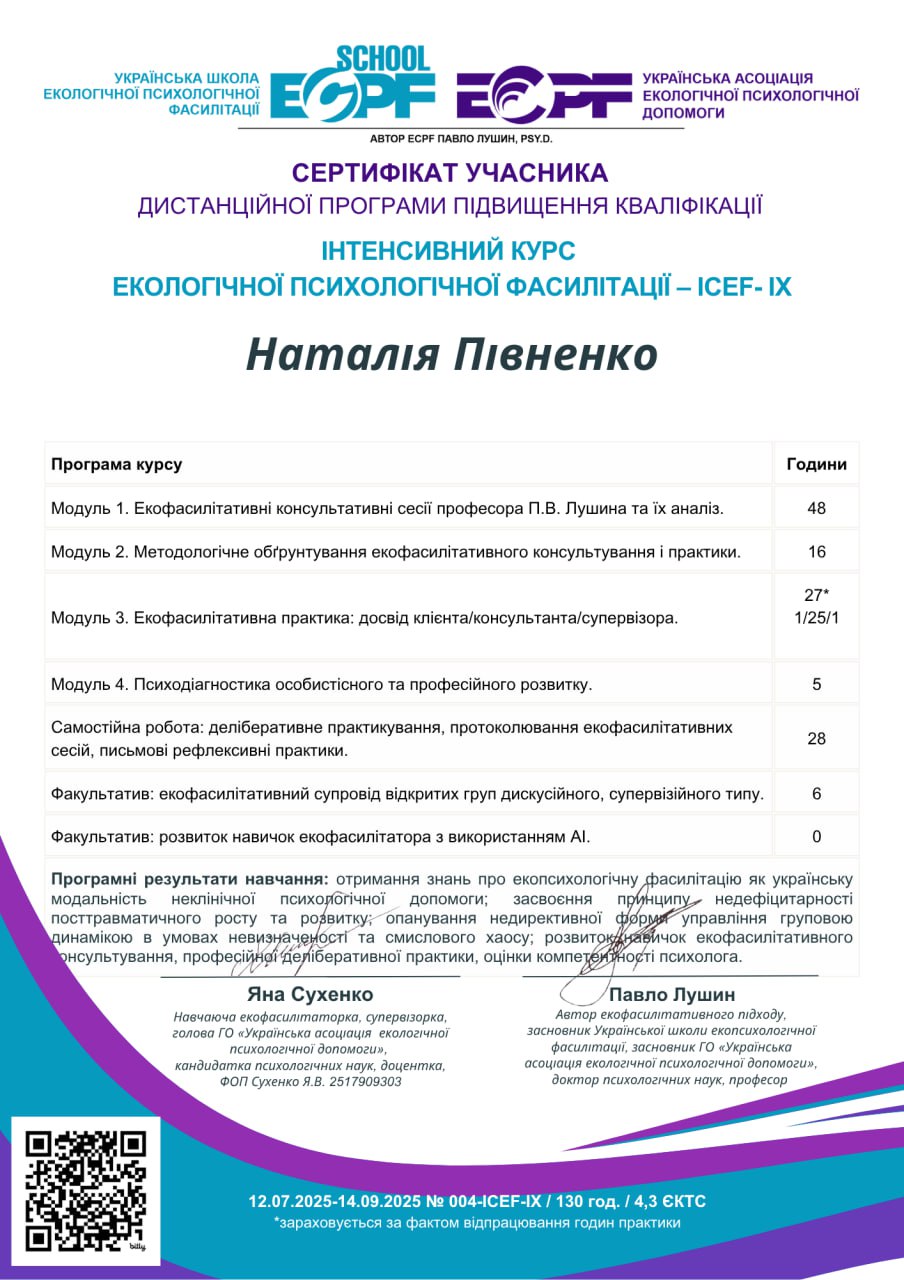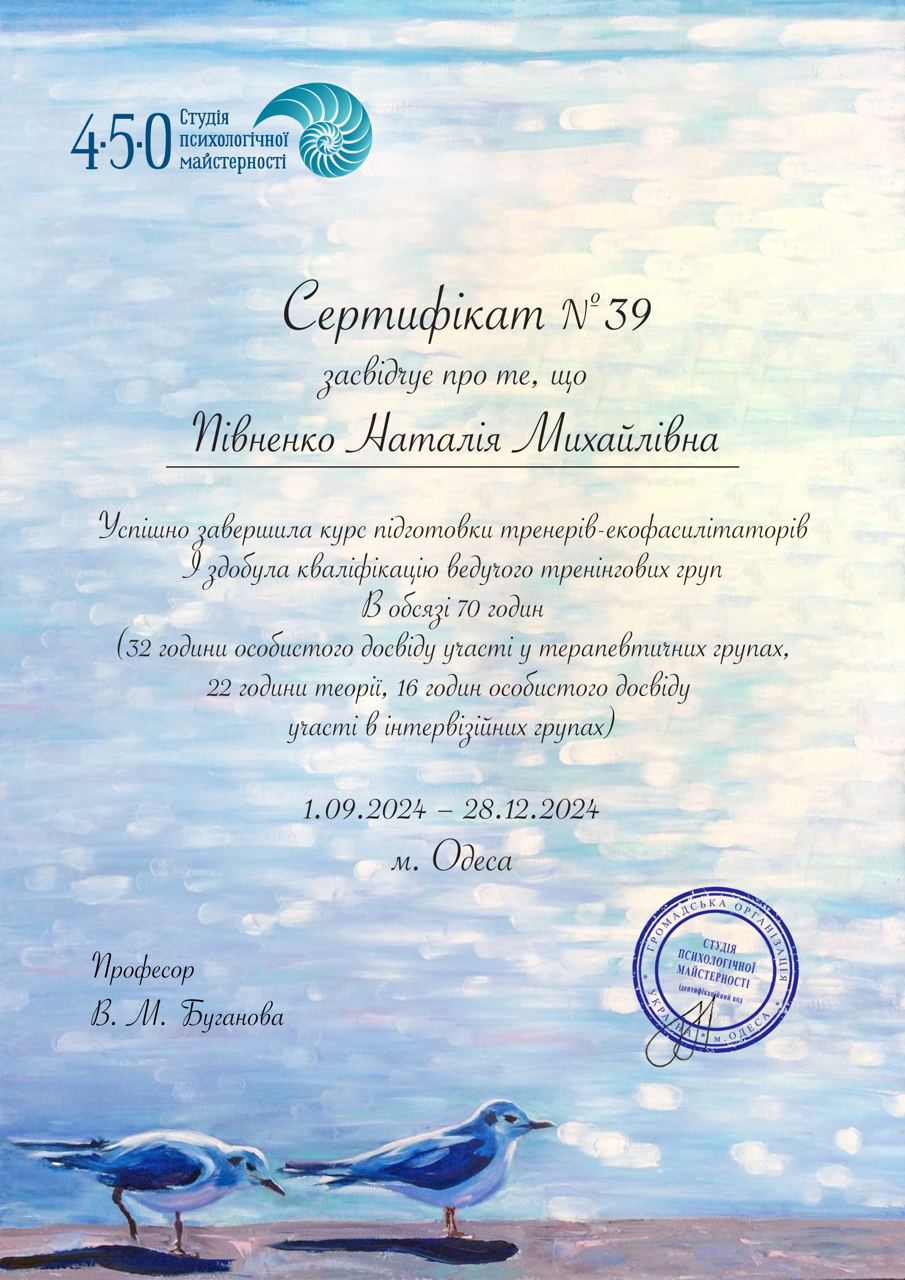 За час моєї практики я працювала з широким спектром запитів клієнтів: тривожні розлади – панічні атаки, соціальна фобія; депресивні стани – зниження настрою, втрата сенсу, апатія, складнощі з мотивацією; травматичний досвід – робота з дитячими травмами, втратою близьких; криза ідентичності – пошук себе, професійне вигорання, вікові кризи; сімейні проблеми – дитячо-батьківські стосунки, конфлікти поколінь; самооцінка – робота з впевненістю, перфекціонізмом, відчуттям власної цінності.